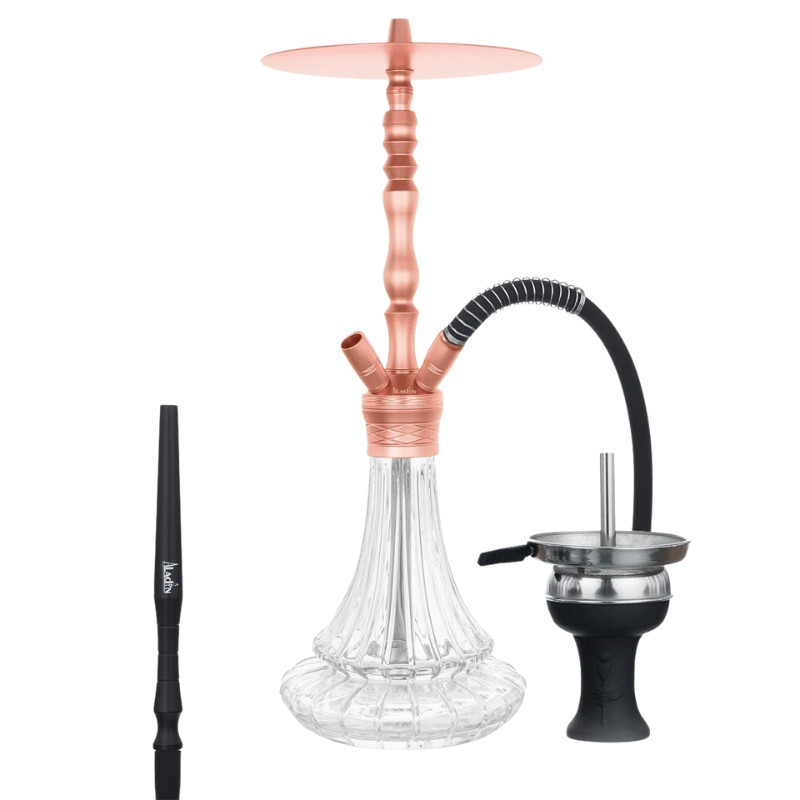 La Cachimba Aladin Alux M8 es una shisha de aproximadamente 58 cm de altura, ideal como cachimba principal para salón o terrazas interiores. Su mástil está fabricado en aluminio, lo que combina ligereza con buena resistencia a la corrosión y facilita el transporte y la limpieza.