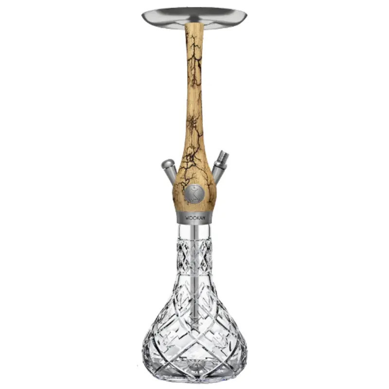 La base WOOKAH Mastercut Olives está fabricada en cristal de alta resistencia sin plomo, completamente hecha a mano desde el soplado hasta el tallado de sus característicos cortes tipo “Olives”. Su acabado totalmente transparente realza el diseño artesanal y la elegancia del conjunto. Incorpora rosca de acero inoxidable 1.4301 (V2A) con grabado WOOKAH.